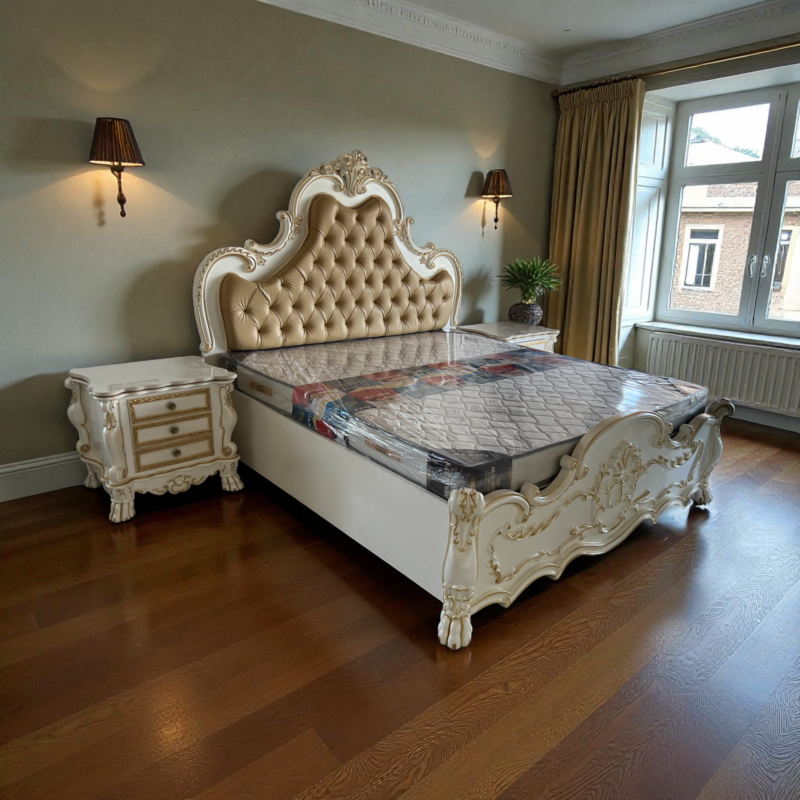 Bring home royal elegance with this Luxury Teak Wood Carved King Size Bed. Featuring Italian white & gold paint, high-density PU foam, and premium fabric upholstery — a perfect blend of comfort and grandeur.