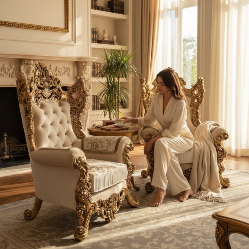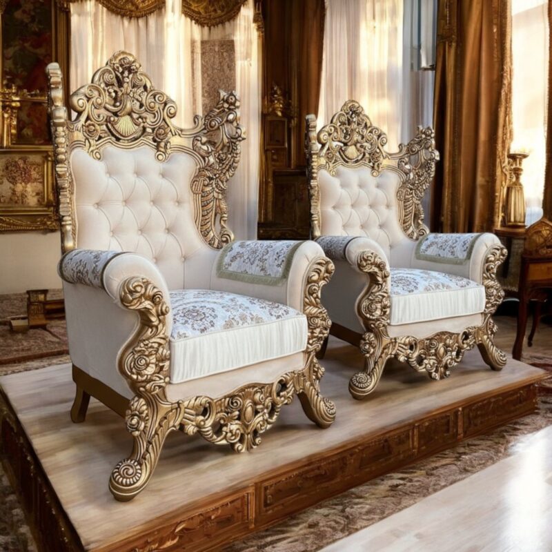 These Luxury Teak Wood Carved Armchairs redefine grandeur. With their majestic white and gold Italian finish, they instantly add an aura of royalty to any space — a true blend of art, comfort, and sophistication.